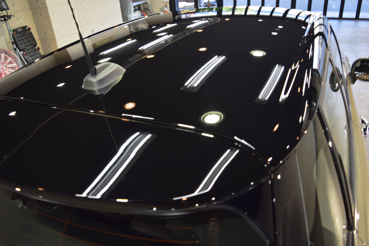 ブラックルーフの塗装面は、保護シートの残りや軽微な傷が多数見受けられました。ブラックルーフに限らずブラック系のカラーの御車は、ちょっと強めに擦って洗車をしたりしてしまうと傷になったり、ちょっとしたことで柔らかい塗装面に傷が入ってしまう取り扱いには細心の注意な塗装であります。特にブラックの塗装面は白く見える傷やシミが大変目立ちます。本来傷から保護する為に貼られた保護シートが残っていたり、シートを剥がした後塗装面に糊が残っており、除去の為に洗車を行った事により洗車傷が大量についたりなど状況は様々でありますがこういったケースはブラック系カラーの御車にはよくあるお悩みであります。せっかくの新車が傷だらけでは悲しいですよね。